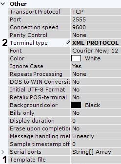 3. If you use an XML parser, select XML PROTOCOL in the Terminal type field (2).