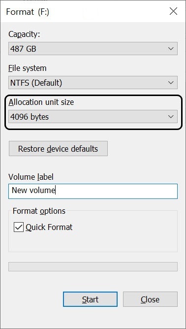 In the Format window that opens, from the Allocation unit size list, select a cluster size greater than 4 KB and click the Start button.