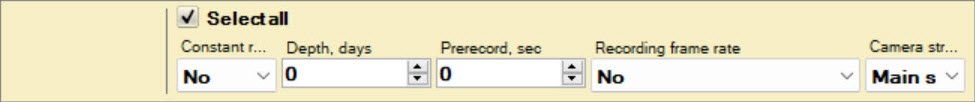 - Configure the archive recording parameters in the group setting form that is highlighted in yellow. The specified settings are automatically applied to all cameras.