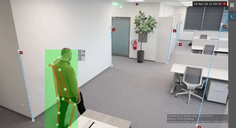 If a camera angle doesn't meet the requirements (see Video stream and scene requirements for the Human pose detector and its sub-detectors), this can result in false events. In this case, we recommend configuring the frame perspective using the leveling rods.