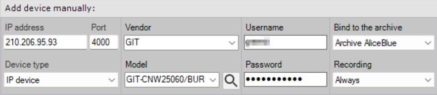 Add this IP device to Axxon One by setting up permanent recording to the archive and selecting Always from the Recording drop-down list (see Searching, adding, configuring and removing IP devices).