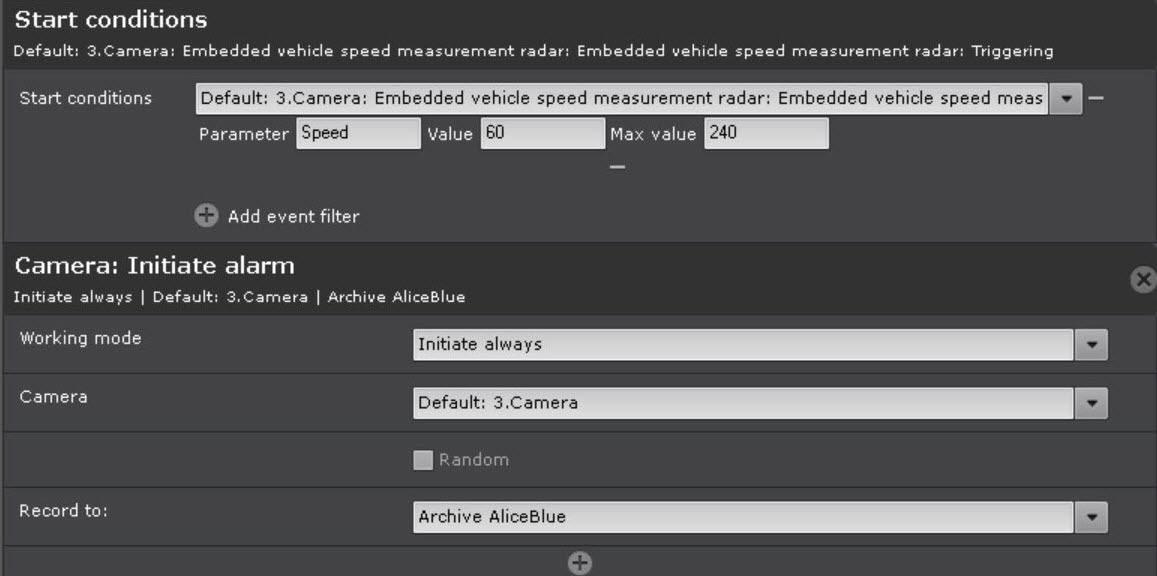 Configure a macro when the Embedded vehicle speed measurement radar detection tool generates an event (see Configuring macros). If necessary, you can configure a macro to initiate an alarm when the vehicle speed is exceeded (see Initiate alarm). To do this: