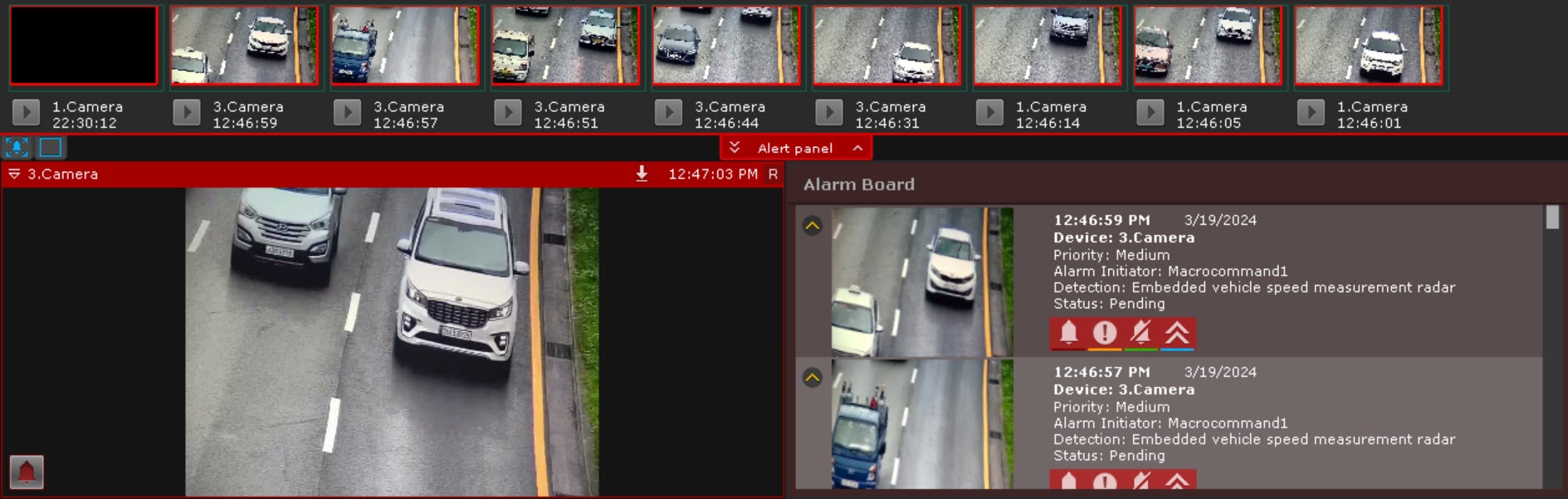 When the vehicles moving at speed that exceeds the values specified in the macro are detected, an alarm is initiated and displayed on the Alert panel (see Alert panel, Working with an Alarm Board).