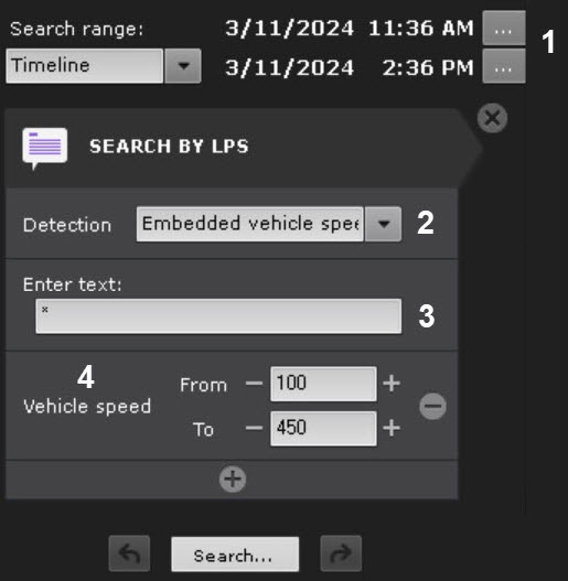 You can search in the archive for events from the Embedded vehicle speed measurement radar detection tool based on vehicle speed. To do this: