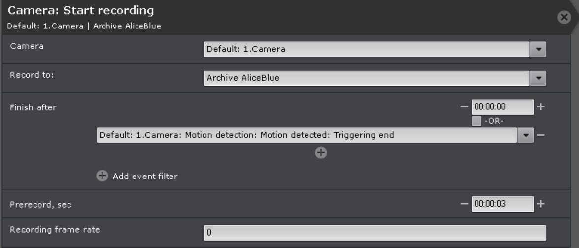 - By default, the prerecord time interval is set to the value specified in the archive settings (see Configuring recording to an archive).