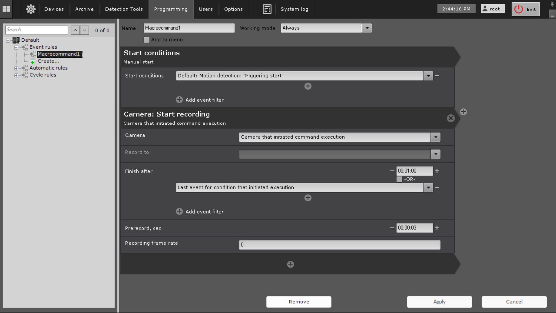 A macro to start recording to the archive when the motion detector generates an event on any camera within the Default Axxon-domain (see Configuring start conditions).