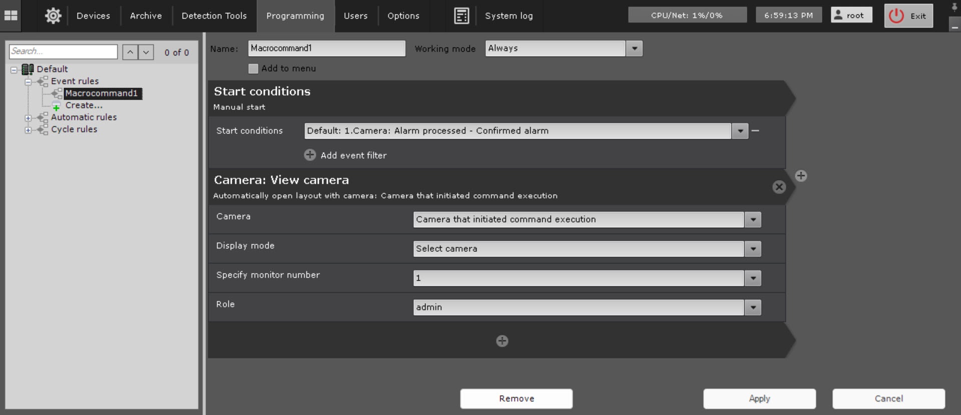 - In the Camera parameter, select a camera that you want to view or a Camera that initiated command execution (see Configuring start conditions).