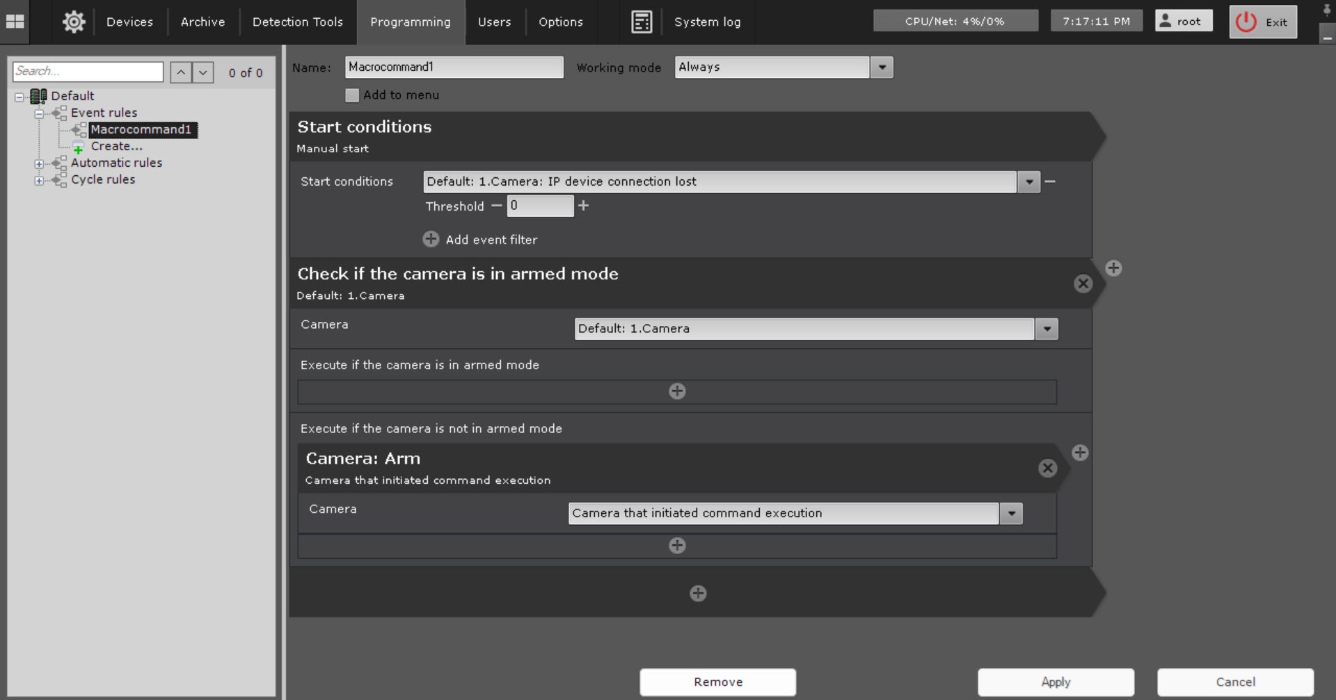 - In the Execute if the camera is in armed mode parameter, select an action that must be executed if the checked camera is in armed mode.
