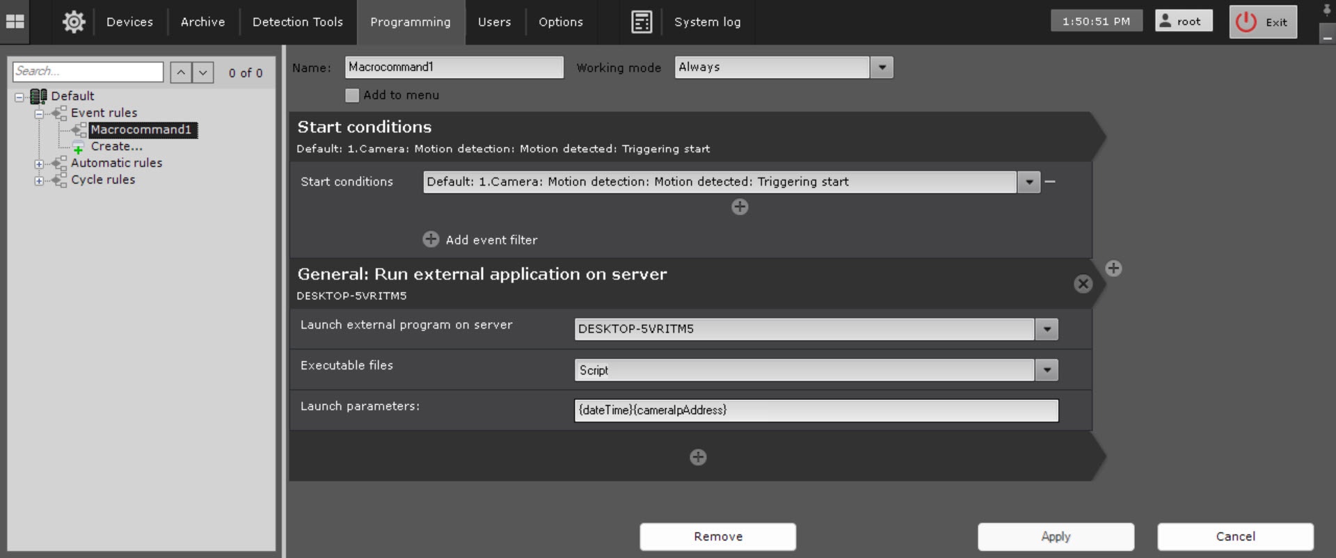 - Add to folder <Axxon One installation directory>\UserScripts\ one or more .bat files with the application startup command. The command must include a path to the executable file of the program. You can specify a network path, command line parameters (see Run external application on client) and use templates (see Text templates in the action settings).