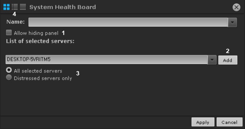 - Select the default view for display of information on the Health Board (see Working with System Health Boards): diagram, diagram with text, or table (4).