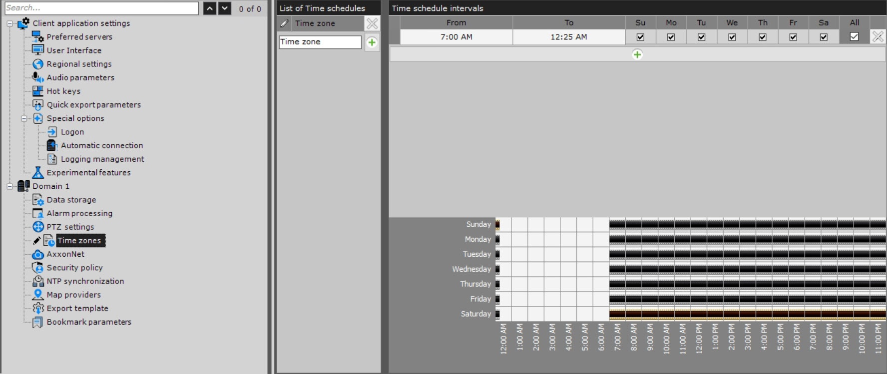 4. Create the necessary number of intervals included in the time zone. A visual display of time intervals for each day of the week is available on the time chart. To delete a time interval, click the button in the corresponding row.