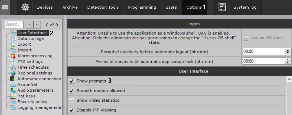 In Axxon One, prompts are displayed when the cursor is hovered over a control element. By default, the prompts are enabled.