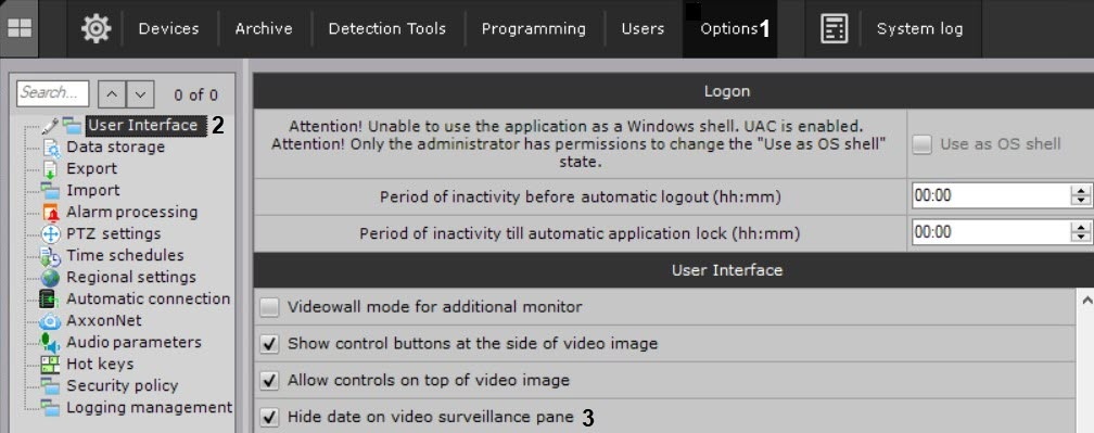- Clear the Hide date on video surveillance pane checkbox (3).
