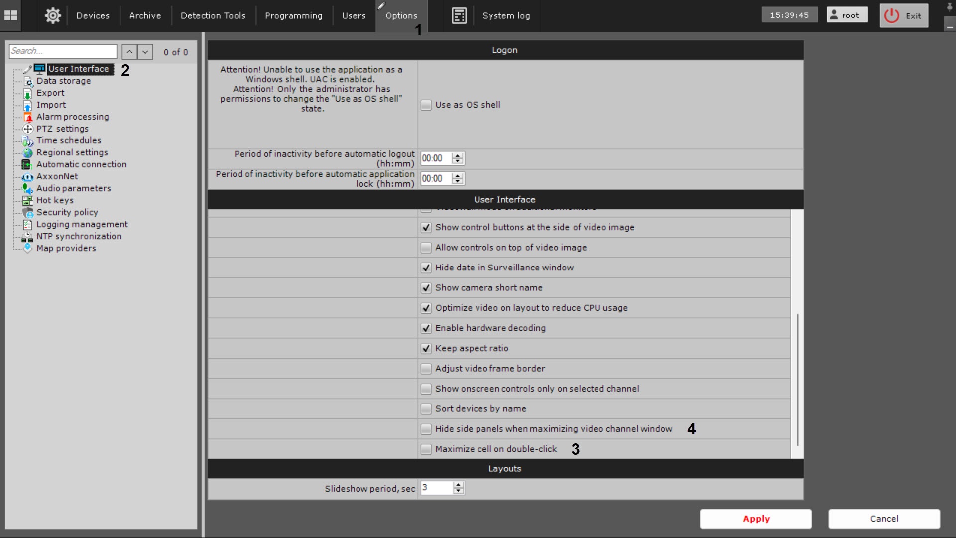 To hide the side panels and the map when the video window is maximized, set the Hide side panels when maximizing video channel window checkbox (4).