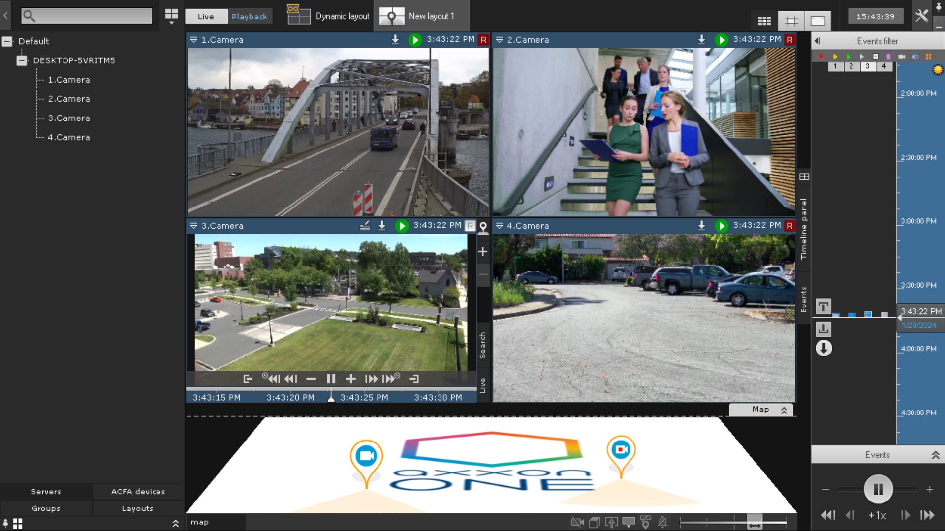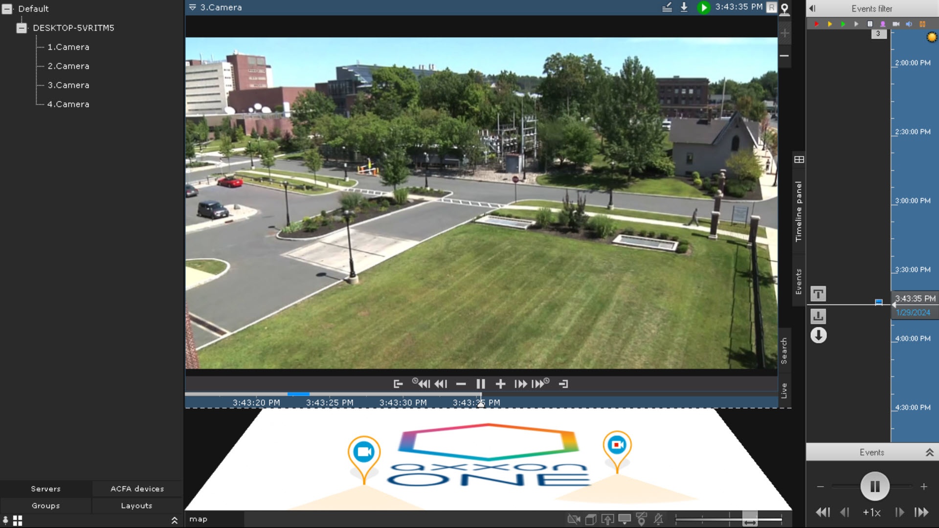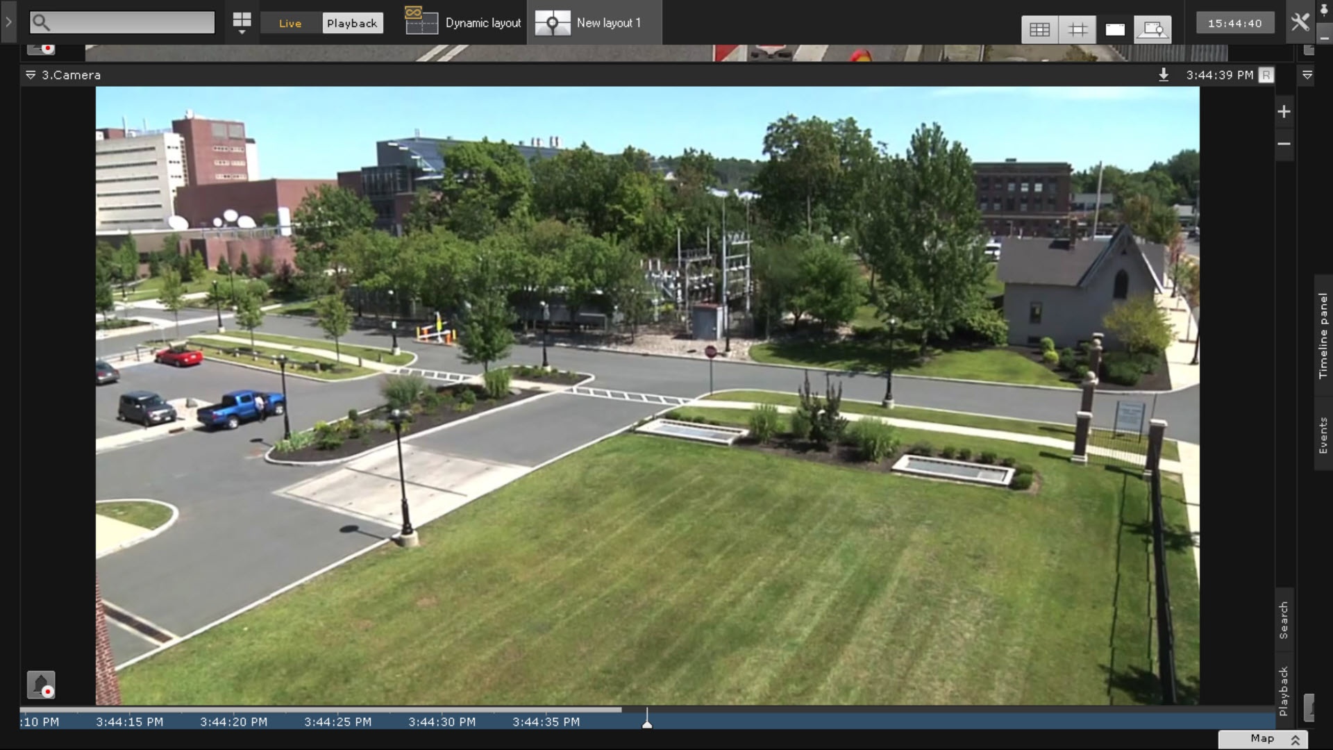 When you double-click on the video window, the top panel will be hidden on the main and additional monitors. The side panels and map will not be hidden; the side panel buttons will always be visible.