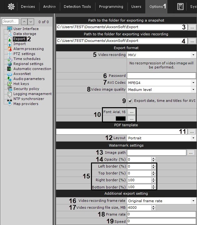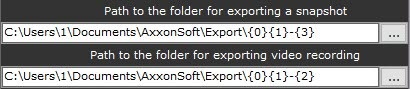 In the Path to the folder for exporting a snapshot (3) and Path to the folder for exporting video recording (4), enter the full path to the folders in which the exported files should be saved. To do this, click the