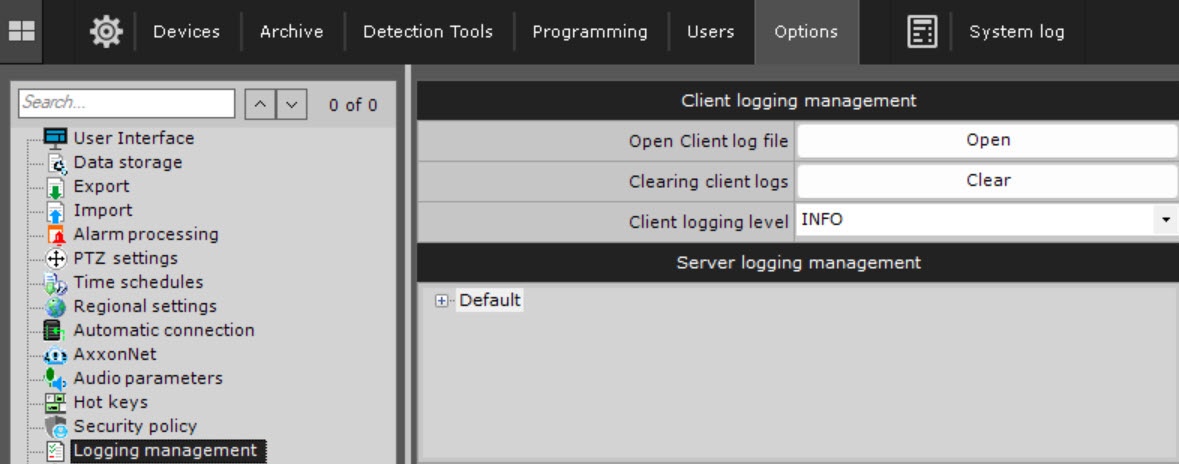 Changes made to the logging level will remain in effect until the Client is turned off. The next time you start the Client, the logging level will correspond to the one specified in the Log management utility.