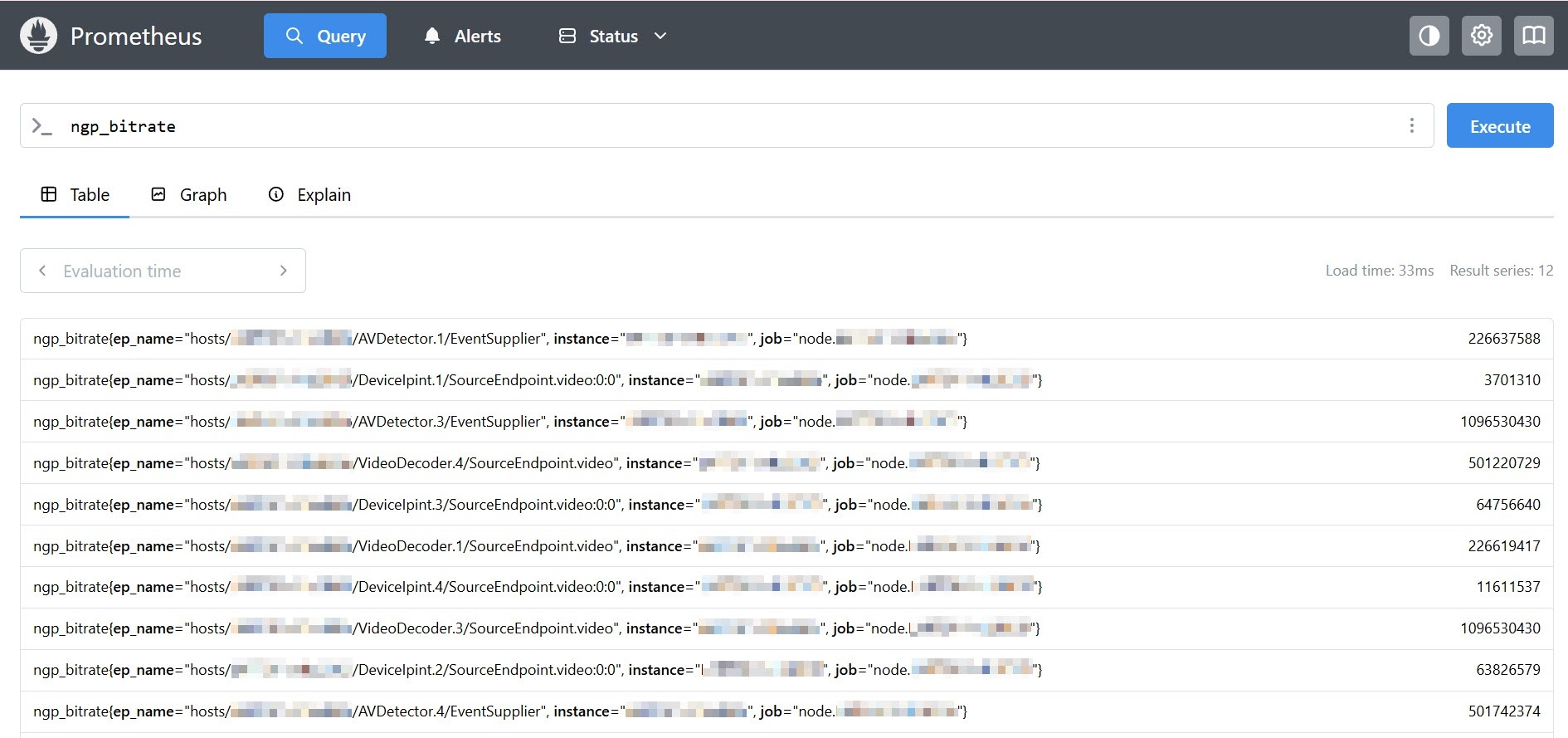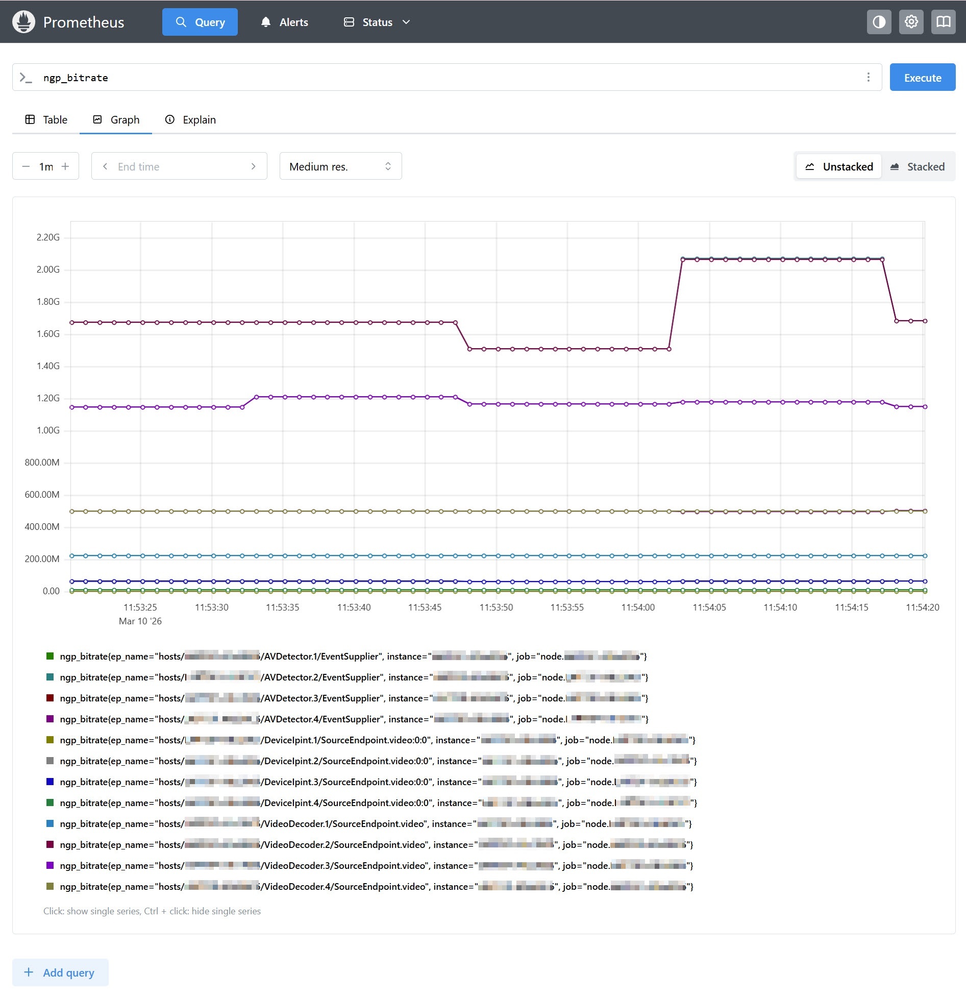 This query allows you to find sources with a frame rate below 17 FPS. For a full list of logical and arithmetic operators, see the Prometheus official documentation
