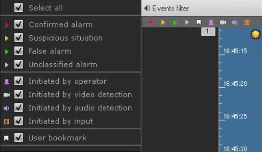 - To display alarms on the timeline, select at least one type of alarm event and one initiator.