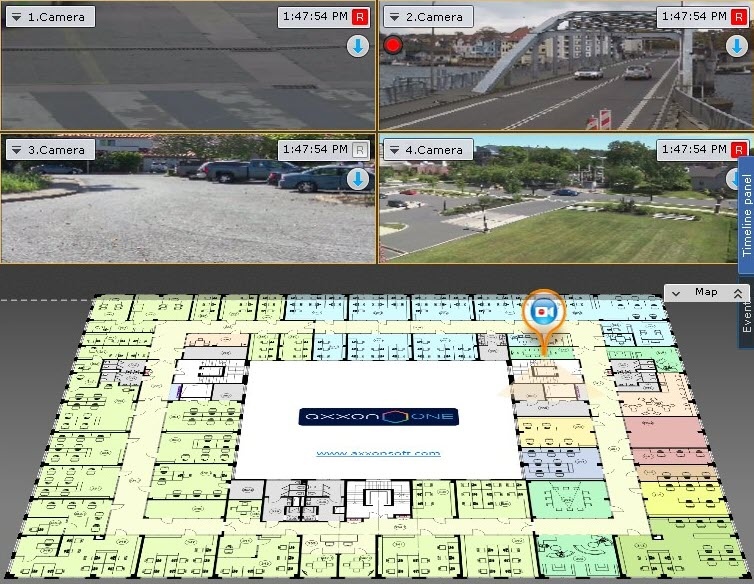 The map can contain icons for cameras, inputs, and outputs. The area in which live video is displayed and field of view are indicated for each camera.