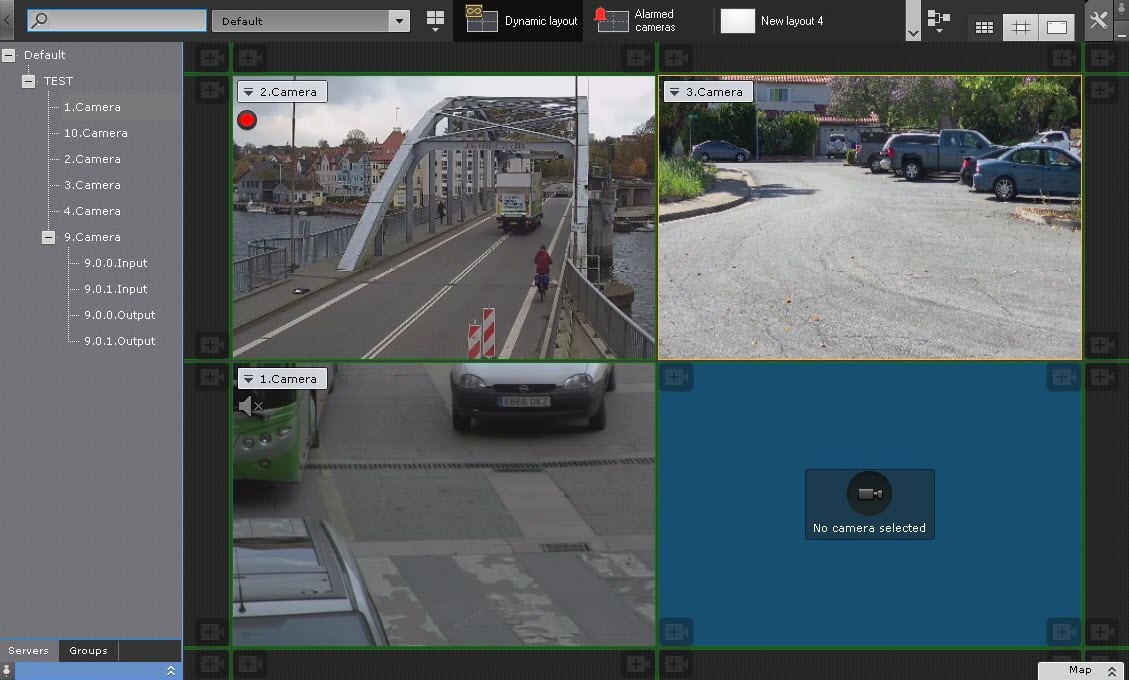 By default, Dynamic layout is empty. You can add cameras from the object panel (see Object panel) one by one or several at once (a group, all video cameras of the Server or Axxon Domains).