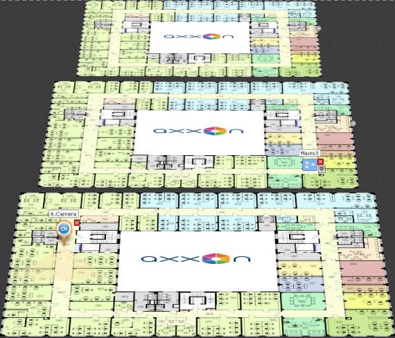 The map can contain icons for cameras, inputs, outputs, and counters. The area in which live video is displayed and field of view are indicated for each camera.