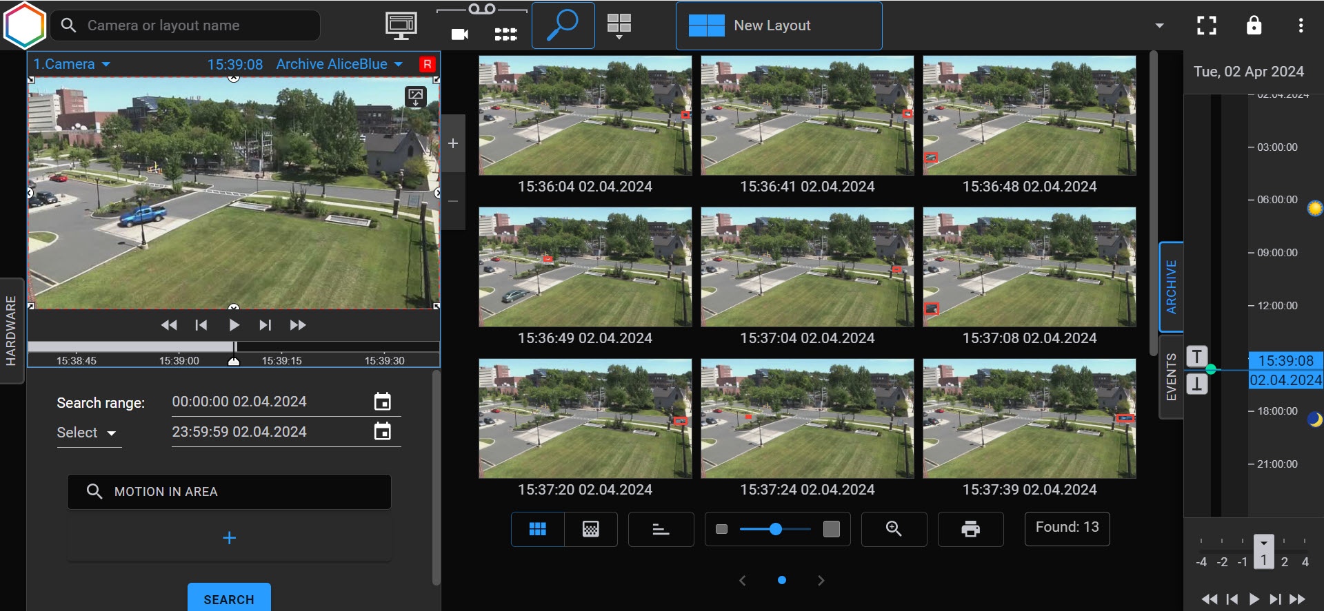 The search in the archive is similar to the search in the Client (see Search in the archive of a single camera). The search results are the video archive frames that match the specified search criteria.