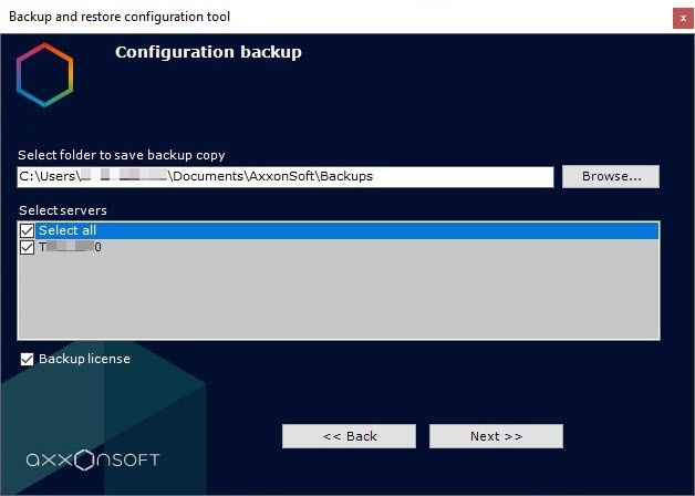 - In the Select folder to save backup copy field, enter the full path to the directory where the configuration backup will be saved. The default directory is <System disk>:\Users\<Current Windows user>\documents\AxxonSoft\Backups. To specify the path using standard Windows tools, click the Browse button.