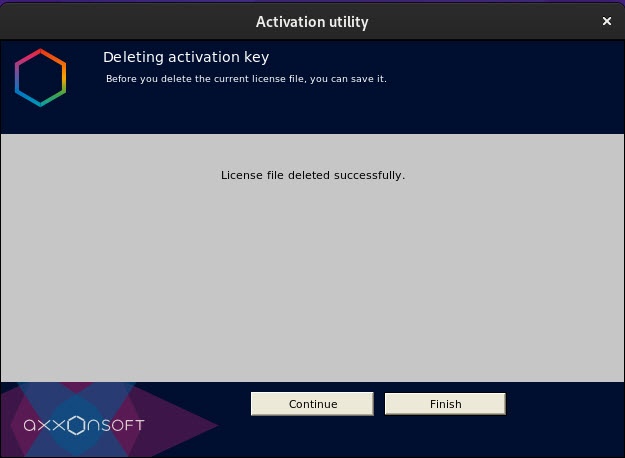 You have deleted a license file. After deleting the license file from the system, the demo license is activated. To return to the main page of the utility, click the Continue button. To exit, click the Finish button.