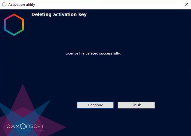 Deletion of the license file from the system is complete. After you delete the license file, the demo license is activated. Click the Continue button to return to the home page of the Activation utility. To exit, click the Finish button.