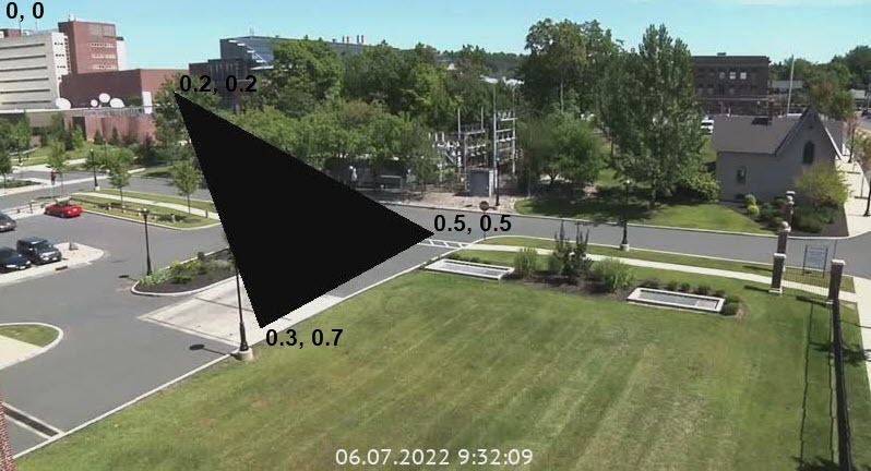 maskspace | Area | An area of a frame for masking, set in coordinates. By default, a frame isn't masked. An area is specified by at least three anchor points + one terminal point (coincides with one of the anchor points). The reference point is the upper left corner. You can specify several areas. Example of an image: | "maskspace": [ [ [ 0.2, 0.2 ], [ 0.3, 0.7 ], [ 0.5, 0.5 ], [ 0.2, 0.2 ] ] ] |