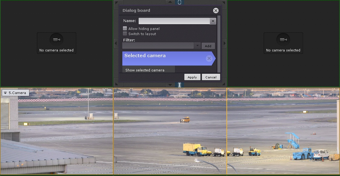 - Left-click the fragment of the empty cell and select a camera or the information board for its filling (see Adding cameras to cells, Adding information boards to cells).