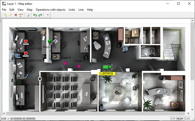 The map is used to monitor and control system devices (cameras, microphones, sensors, relays, etc.) and to launch macros.
