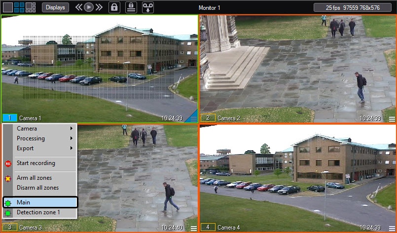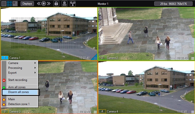 To switch off all available detection tools simultaneously, select the Disarm all zones item in the video surveillance window functions menu.