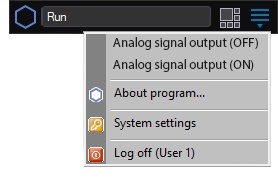 The availability and names of the macro commands in the Run menu used to switch on and off the analog signal output to the external devices, depends on the program configuration.