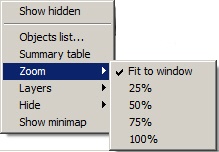 To set the scale, select the required scale value in the Zoom submenu or click the Fit to window item that is used to set the scale, allowing the full Map image to fit into the Map window. The selected scale is saved when you restart Axxon PSIM.