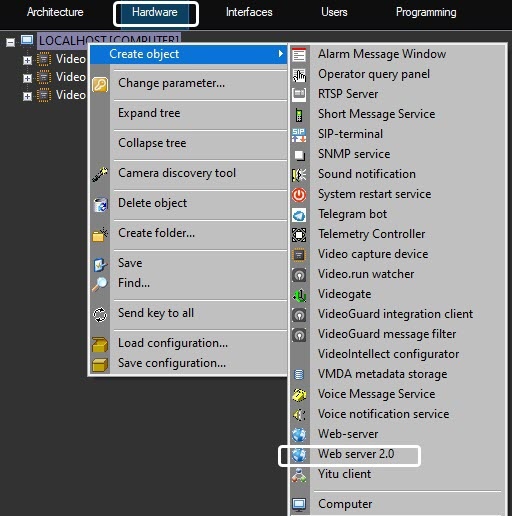 In the Axxon PSIM software the Web server 2.0 object is based on the Computer object on the Hardware tab of the System settings dialog box.