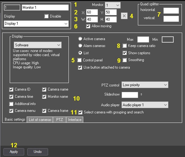 Fields in the Quad splitter group are inactive if the Alarm cameras mode is selected (see Configuring the display mode of camera windows).