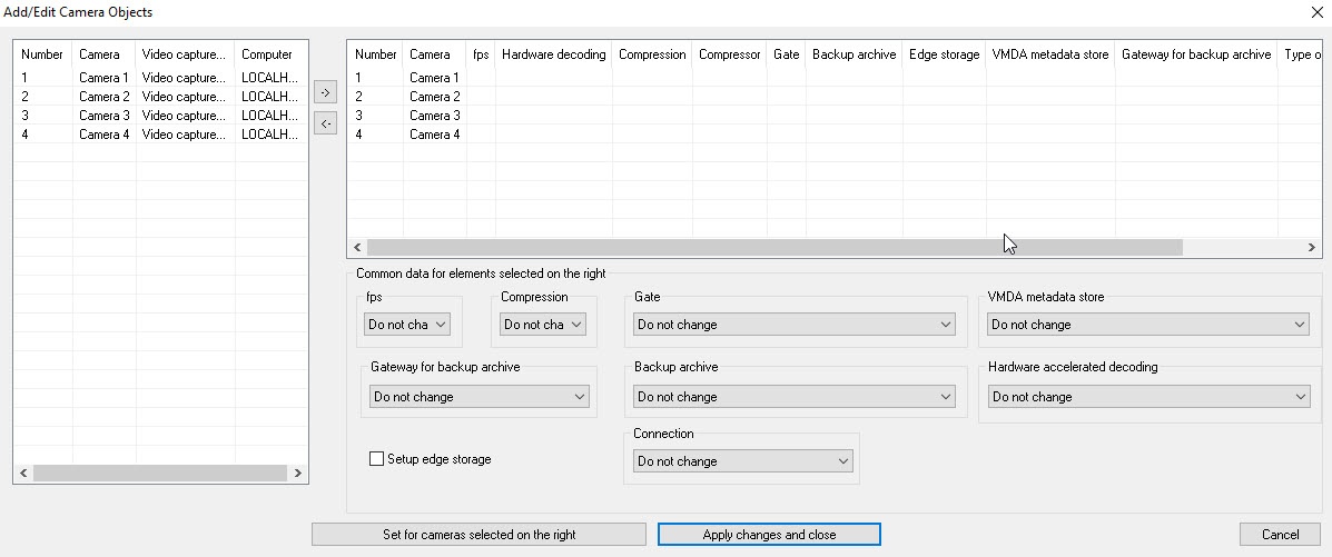 If it is necessary, select the names of required cameras in the right list for bulk editing of their parameters.