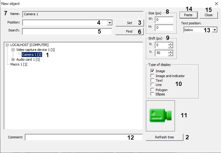Select the required object in the objects tree of the New object dialog window (1). The objects tree displays only the objects that can be added to a layer, or objects whose child objects can be added to a layer.
