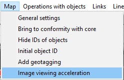 If many objects (1-2 thousand) are attached to a layer, there may be problems when they are displayed in the interactive map window due to operating system limitations. In this case, enable the Image viewing acceleration in the Map menu.