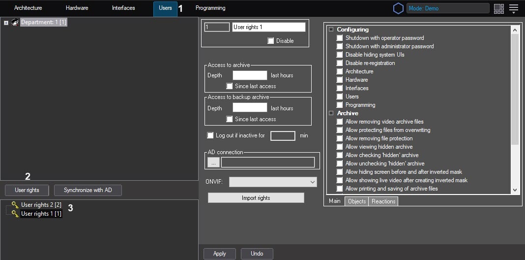 - The created object appears in the object tree below the User rights button, and the settings panel for this object opens on the right side of the System setting window (3).