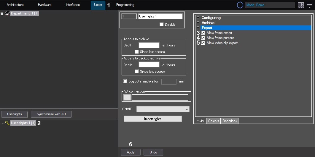 5. To forbid the operator to export archive clips, clear the Allow video clip export checkbox (5).