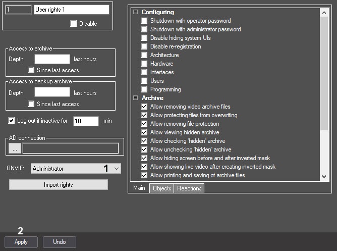 2. From the ONVIF drop-down list (1), select the type of rights corresponding to the user rights in Axxon PSIM.