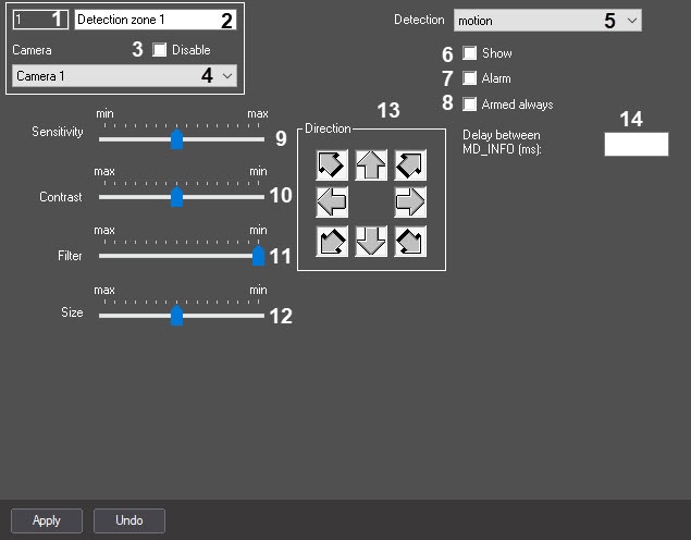 14 | The Delay between MD_INFO (ms) | Enter the value in the field | Sets the time period in milliseconds between the MD_INFO events of the CAM_ZONE detector in the Event viewer (if the MD_INFO event is included in ddi) | Integer number | NA | >=0 |