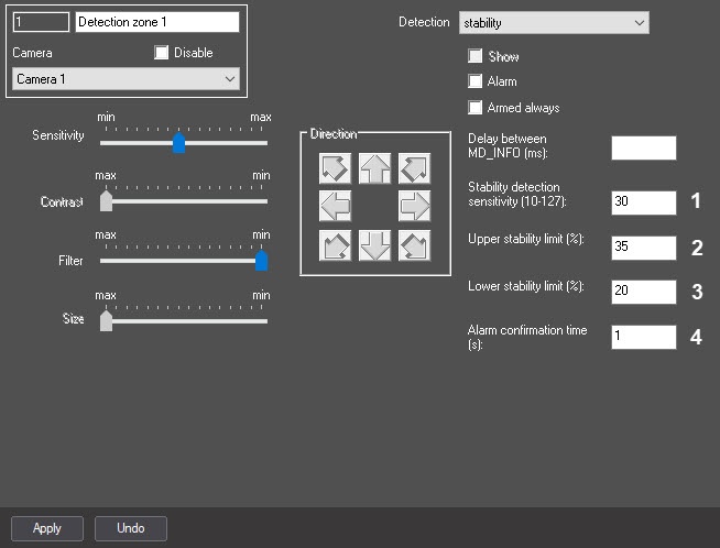 1 | The Stability detection sensitivity (10-127) field | Enter the value in the field | Sets the threshold of difference between the brightness of the pixel in the current frame and the background | Integer number | 30 | From 10 to 127 |