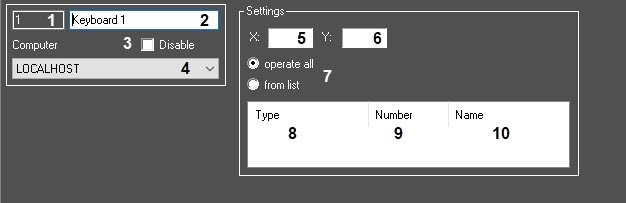 7 | Control devices* | Set the switch in the required position | Sets the interface objects that can be controlled using the keyboard | List of device types for control | Operate all | Operate all—the operator can control all interface objects according to the settings in the keyboard configuration file From list—the operator can control only those interface objects that are specified in the list below |