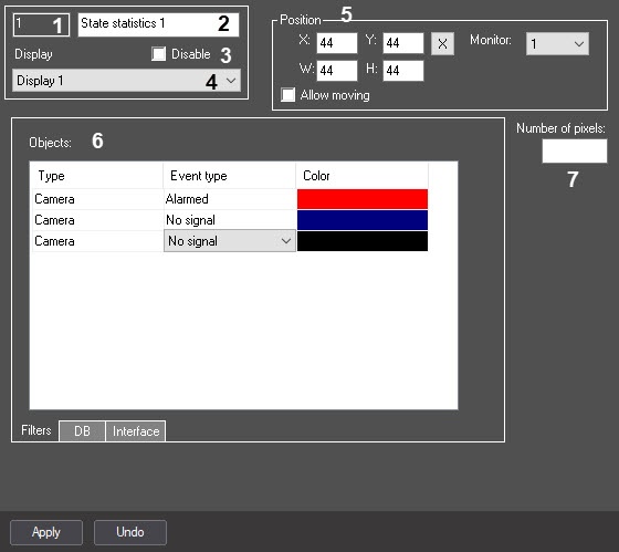 | 7 | The Number of pixels field | Enter the value in the field | Sets the number of pixels to be displayed on the state statistics graph | Integer numbers | 0 | >=0 |