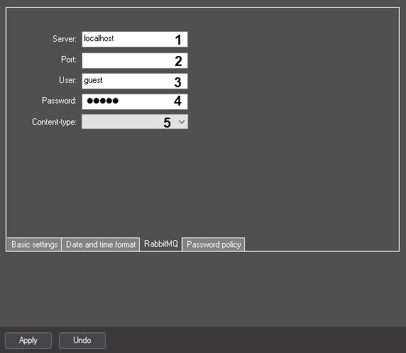1 | The Server field | Enter the value in the field | Sets the RabbitMQ server address | Latin alphabet, digits, and service characters | localhost | Server IP address or name |