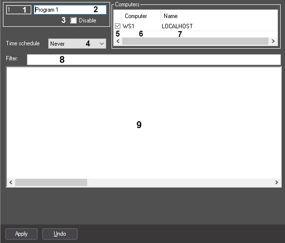 4 | The Time schedule | Select the value from the list | Sets the time period during which the given program operates | Name of the time schedule registered in the system | Never |